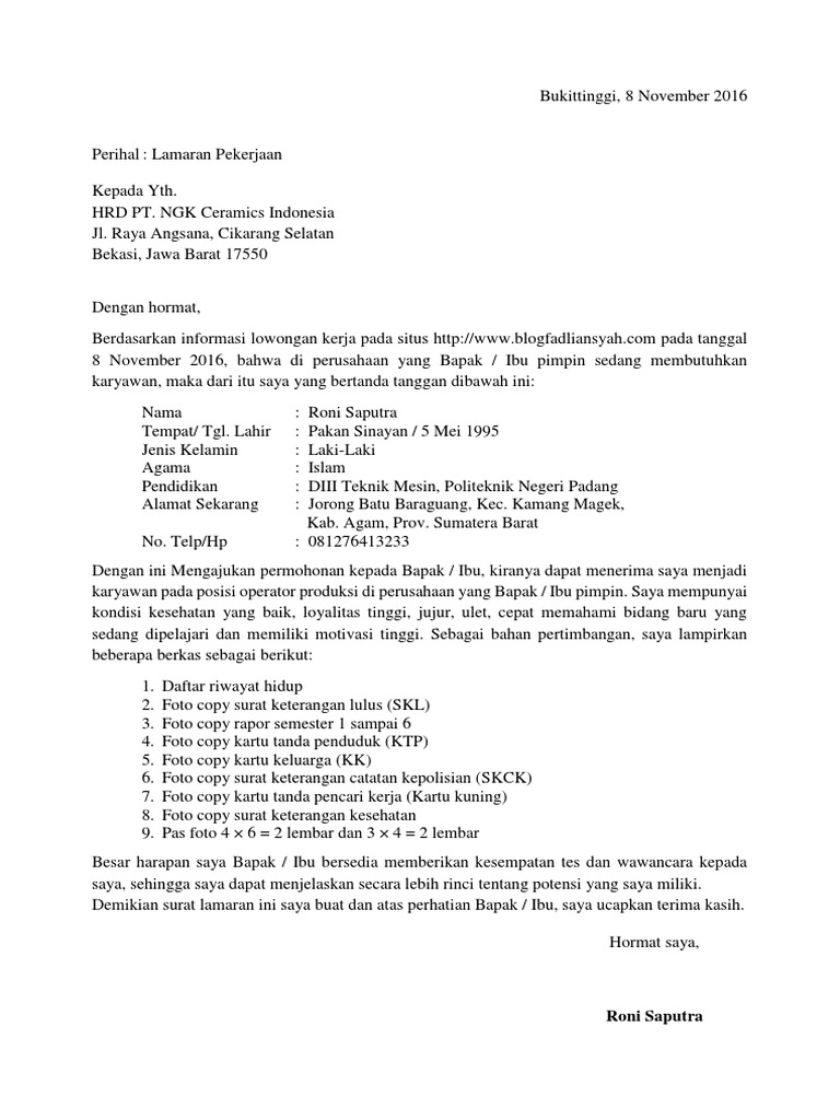Contoh surat lamaran kerja umum, bank, karyawan, alfamart, pt, sekolahan, formal, fresh graduate, bahasa inggris, via email, tulis tangan, simple pengalaman sebagai operator komputer di rental komputer selama hampir 4 tahun menjadikan saya terbiasa untuk bekerja keras. Demikian surat lamaran ini saya buat, atas perhatian dari bapak kepala sekolah sma arrohmah malang, saya sampaikan banyak terima kasih. Contoh surat lamaran kerja yang baik dan benar selalu menjadi solusi kamu yang ingin melamar pekerjaan disuatu perusahaan atau instansi pemerintah. Contoh surat lamaran kerja di perusahaan umum i. Atas perhatian bapak/ibu pimpinan, saya ucapkan terima kasih.